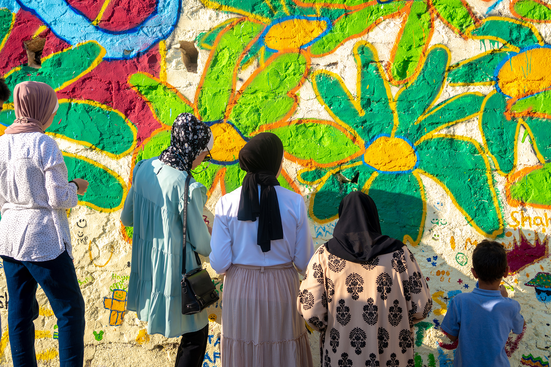 The finished product. 7Hills on the left in the blue graffiti by Siner, “Ahlan wa Sahlan” in the orange calligraphic script by Chaf, and paintings by everyone. Ahlan wa Sahlan translates to Welcome, a reminder that this is for everyone.